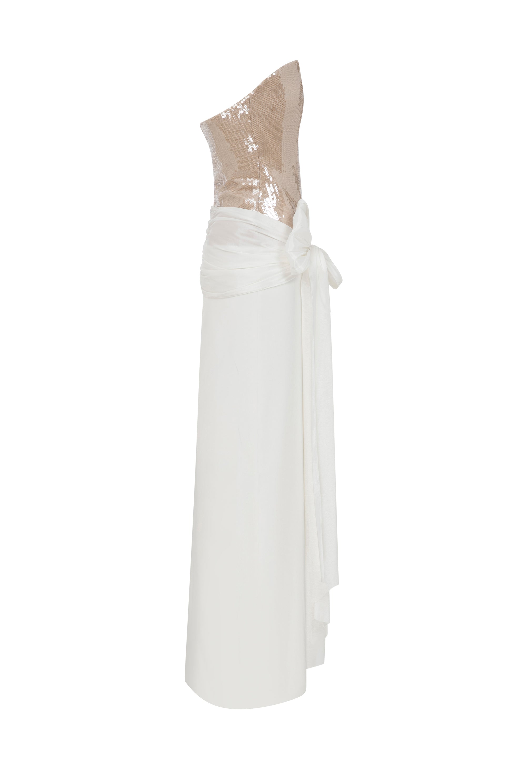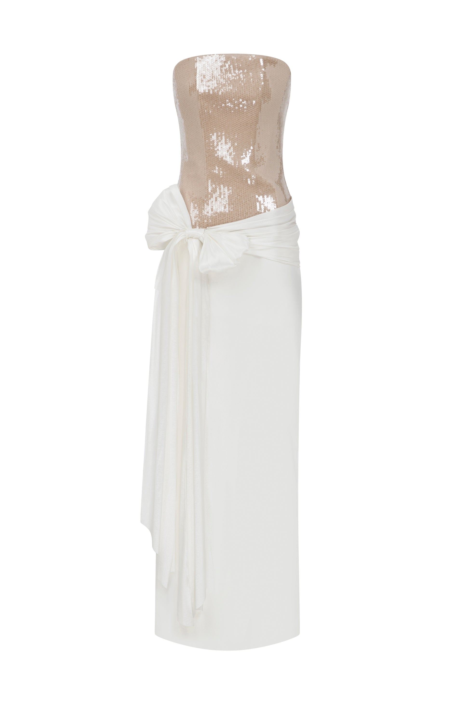 Strapless Long Dress with Sequin Mix and Waist Tie
